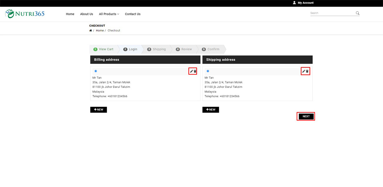 Choose your billing/shipping address. You can also edit them with the pen icon. Click "Next" button to proceed once you're done.