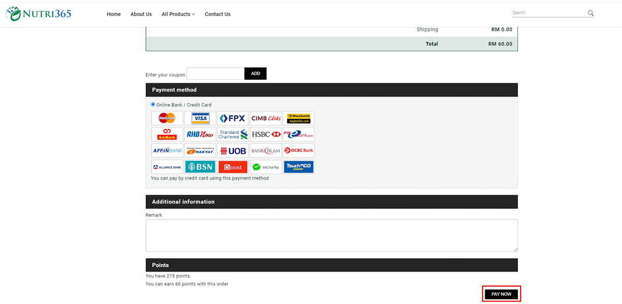 Confirm your order and click the "PAY NOW" button to end your purchase. You can enter the coupon number if available.